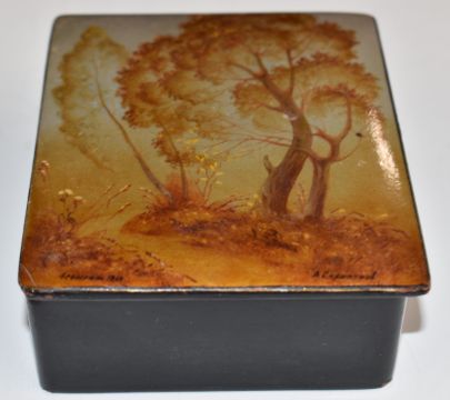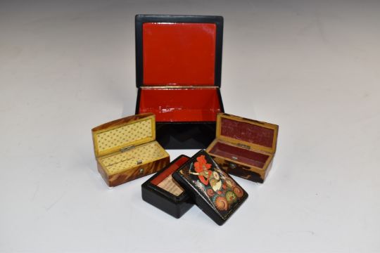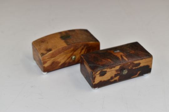 Two signed Russian lacquer boxes, length of larger 10.5cm, and two 19thC tortoiseshell snuff boxes