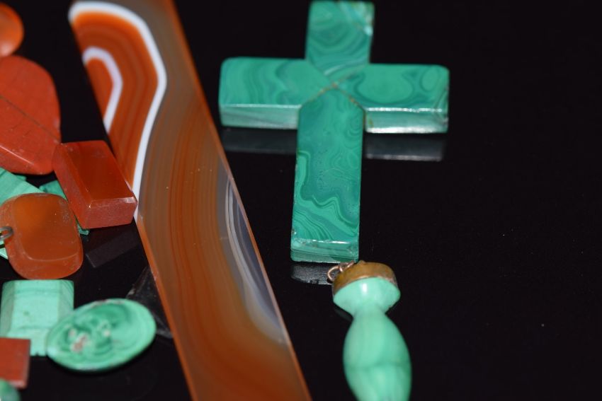 A collection of loose malachite and carnelian agate cabochons and plaques