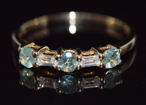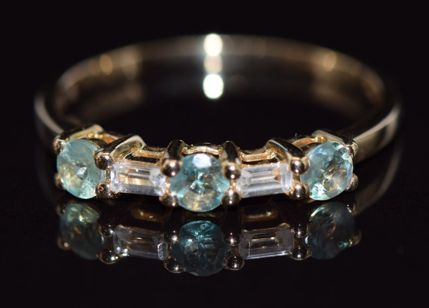 A 9ct gold ring set with round cut green sapphires and baguette cut white sapphires, 18g, size P/Q