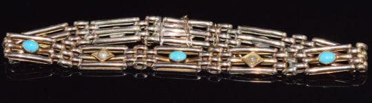 Edwardian 9ct rose gold bracelet set with seed pearls and turquoise, 9.7g