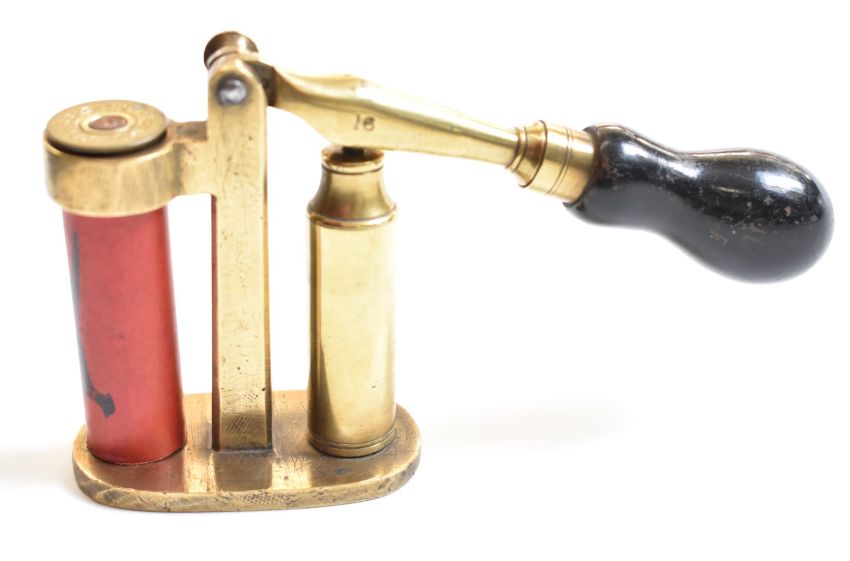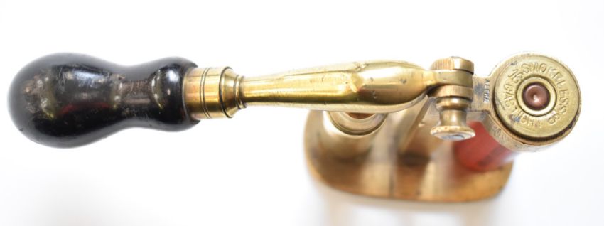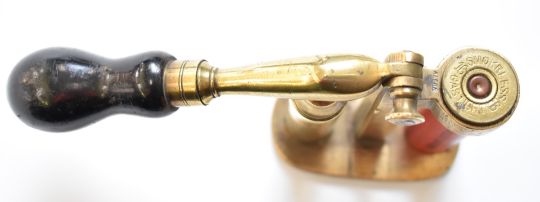 Brass 16 bore shotgun cartridge capper and decapper tool with turned wooden handle and Eley shotgun cartridge case.