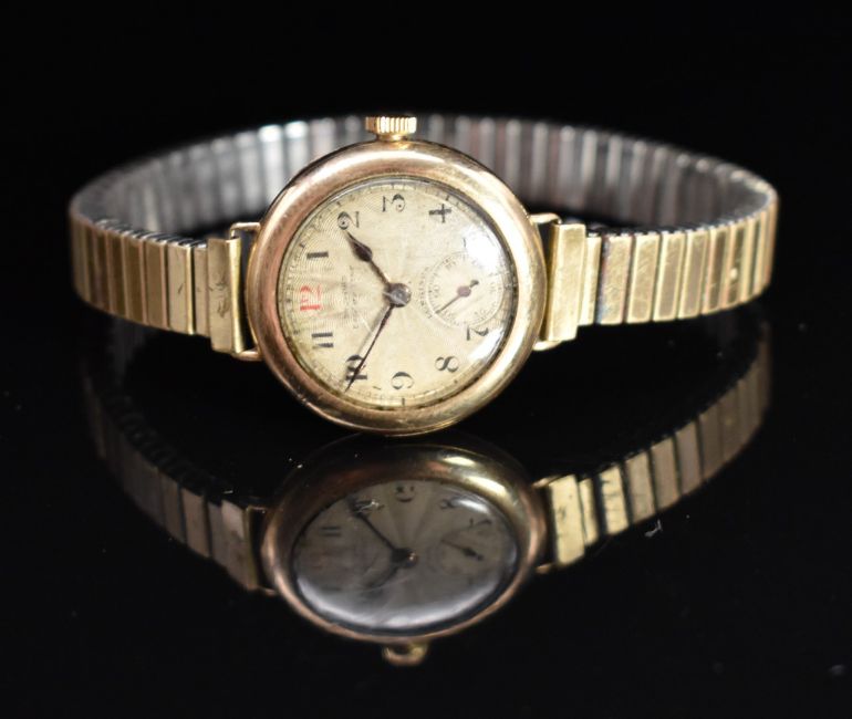 Two 9ct gold ladies wristwatches one by Bruford of Eastbourne both with subsidiary seconds dials, blued hands, Arabic numerals and silver dials, largest case diameter 26mm.