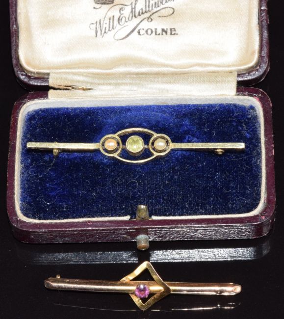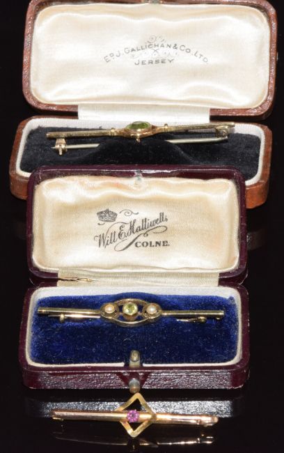 A 15ct gold brooch set with peridot (3.1g), 15ct gold brooch set with peridot and pearls (3.1g) and a 9ct gold brooch set with an amethyst (1g), in three vintage boxes