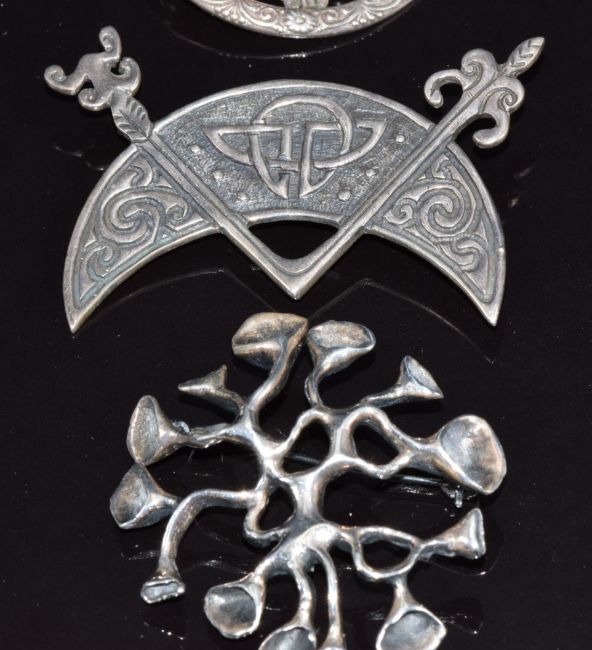 Three silver brooches, one in the form of a thistle by W B S, a Scottish silver example and one other