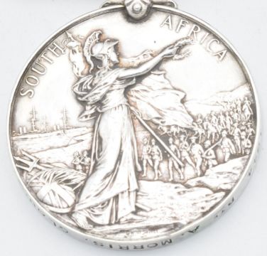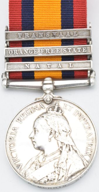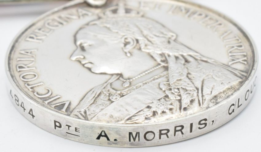 British Army Queen's South Africa Medal 1899 with clasps for Natal, Orange Free State and Transvaal, named to 4844 Private A Morris Gloucestershire Regiment