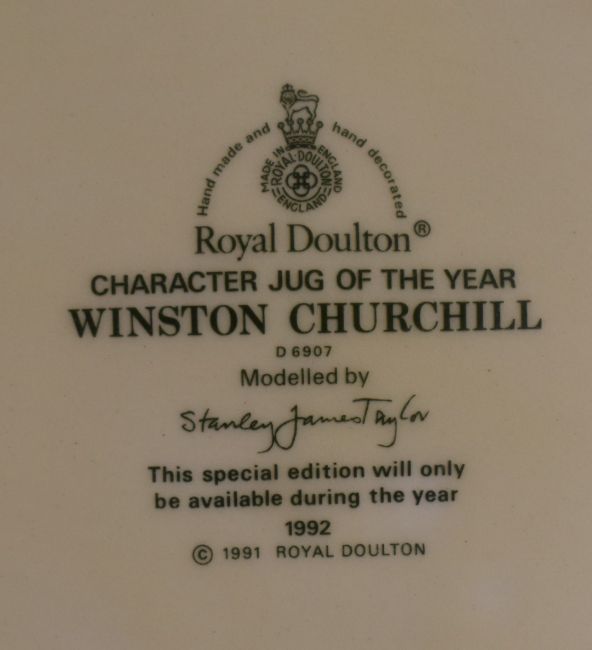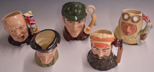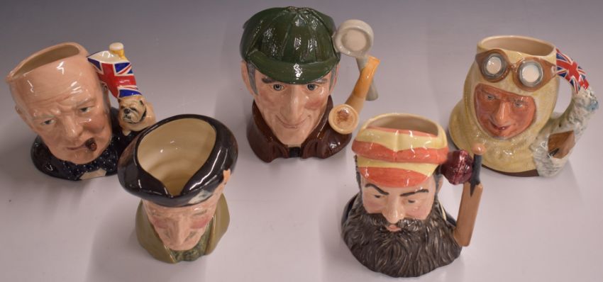 Five large Royal Doulton character jugs comprising Churchill, Captain Scott, WG Grace, The Sleuth and Monty