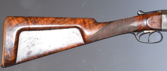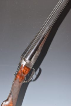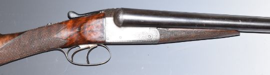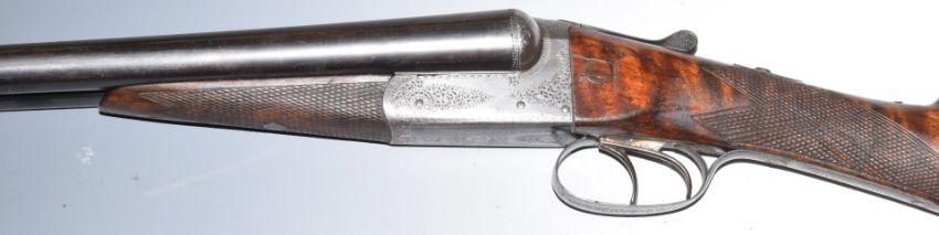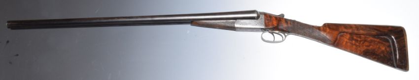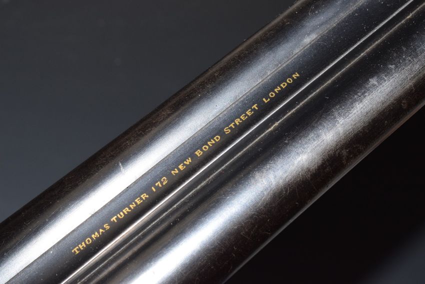 Thomas Turner 12 bore side by side shotgun with scrolling engraving to the locks, trigger guard, underside, top plate, thumb lever and fences, named top plate, chequered grip and forend, lightweight stock, double trigger and 28 inch barrels choked cylinder and ΒΌ and inlaid in gold 'Thomas Turner 172 New Bond Street London', overall length 113.5cm, length of pull 37cm, serial number 5984. PLEASE NOTE THAT A VALID RELEVANT FIREARMS/SHOTGUN CERTIFICATE IS REQUIRED TO HANDLE/PURCHASE THIS ITEM.