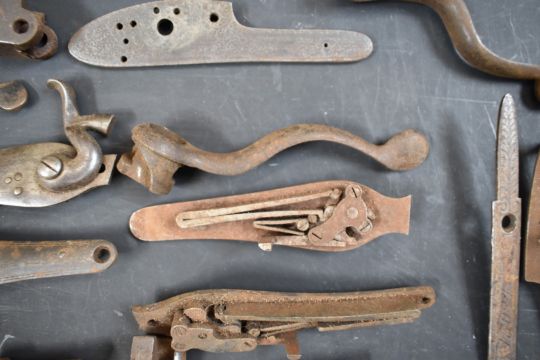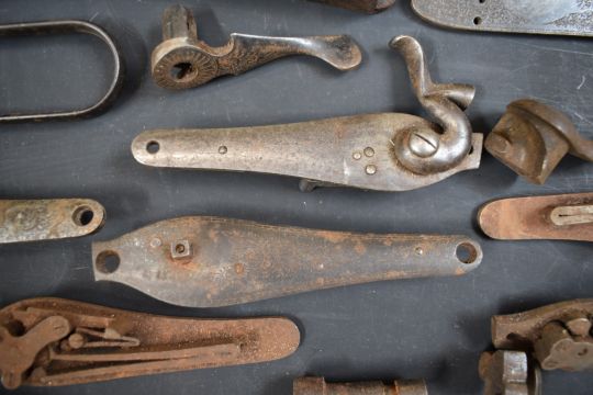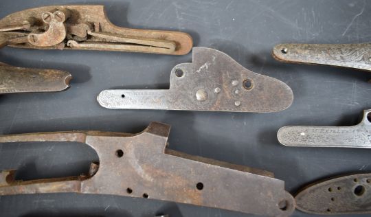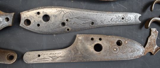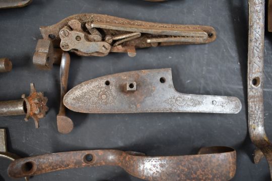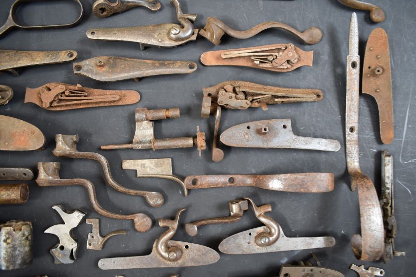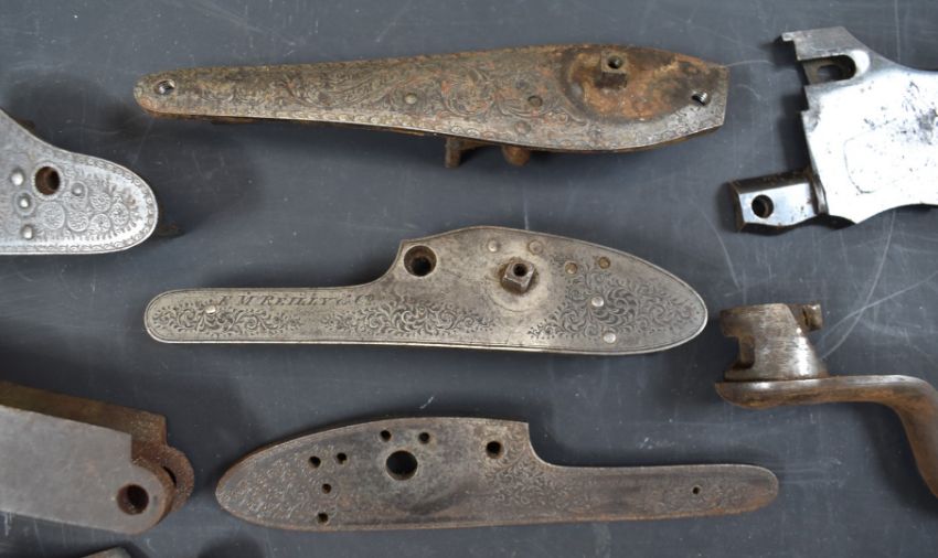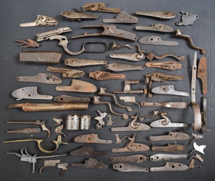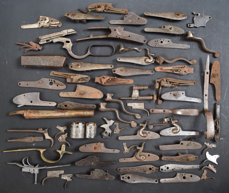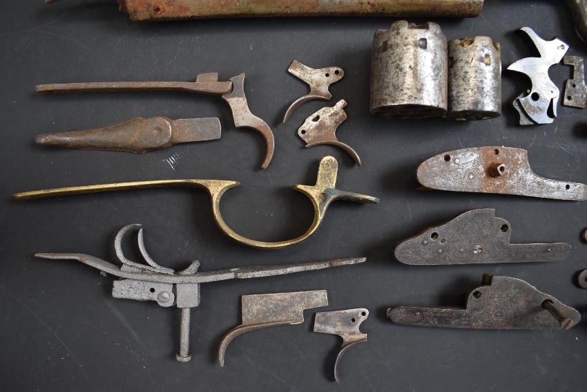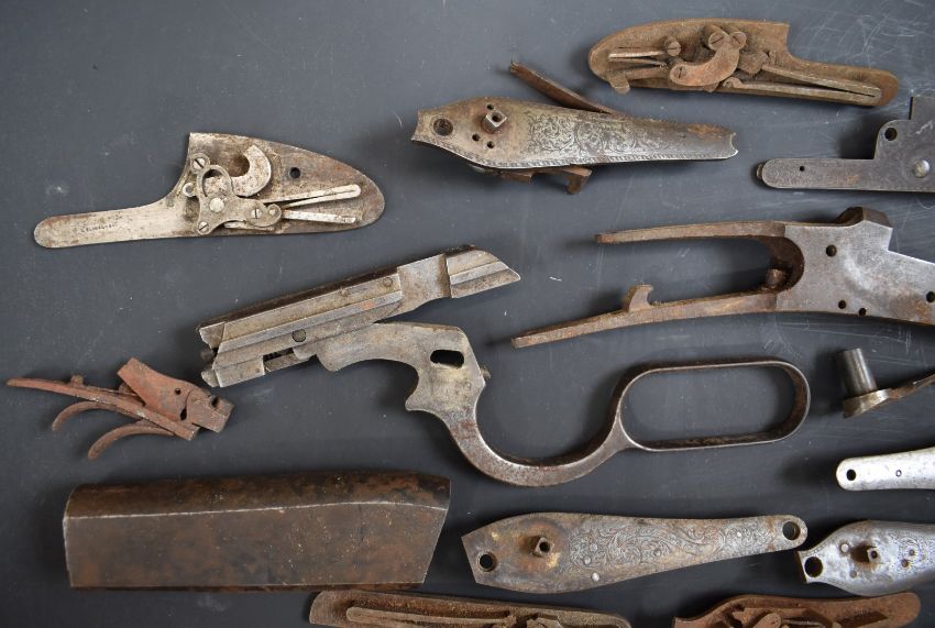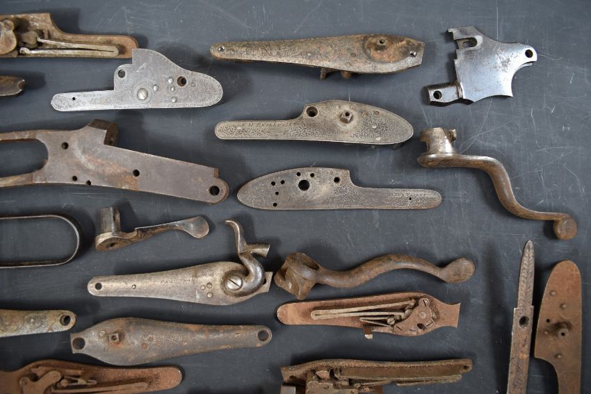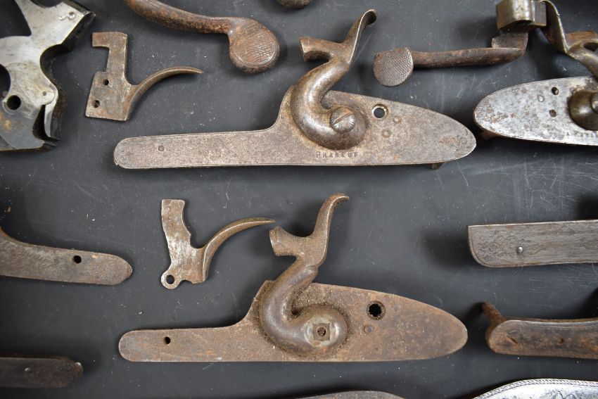 A collection of shotgun, pistol and revolver parts including cylinders, trigger guards, Winchester style Martini underlevers and lock plates some pairs and some named E M Reilly & Co, Thomas Adsett, W Mills, T Page-Wood of Bristol, The Demon, T Bland & Sons, Thomas Horsley's Patent etc.