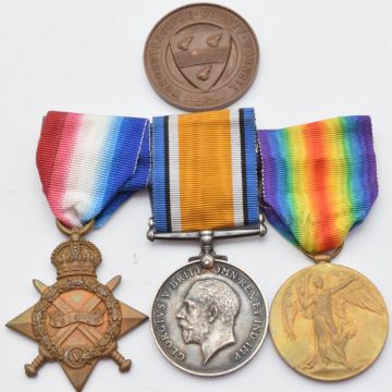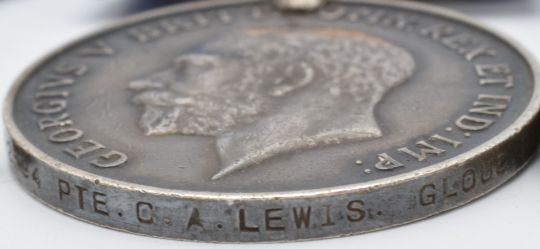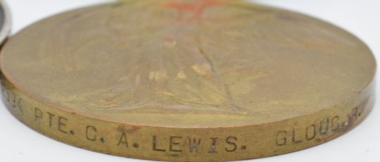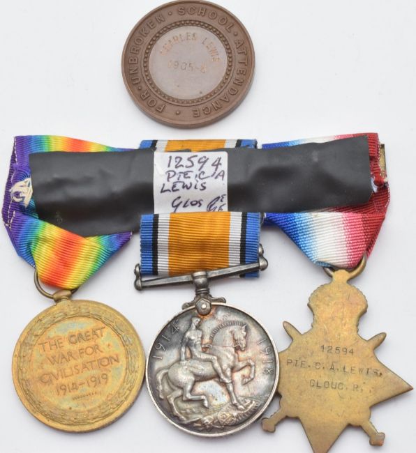 British Army WW1 medals comprising 1914/1915 Star, War Medal and Victory Medal named to 12594 Pte C A Lewis, Gloucestershire Regiment, together with an Attendance School medal and a copy of the medal index card