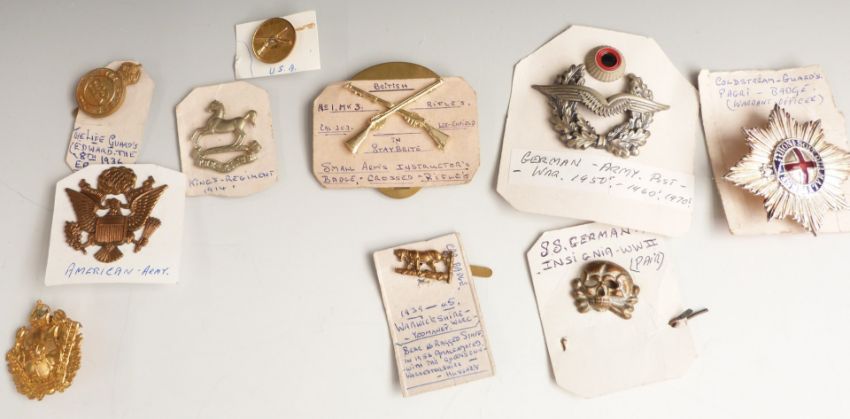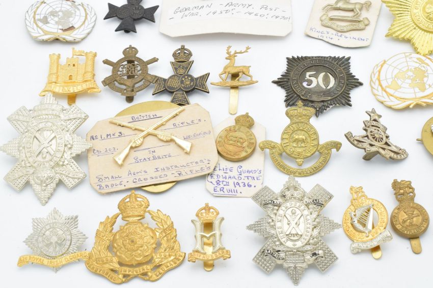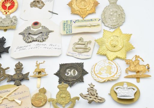 Collection of approximately sixty badges including Wessex Regiment StayBrite by J R Gaunt, B'ham, Royal Dublin Fusiliers, 19th Hussars, Coldstream Guards, T R F A Gloster shoulder title and Cameronians Chaplains department, mostly restrikes