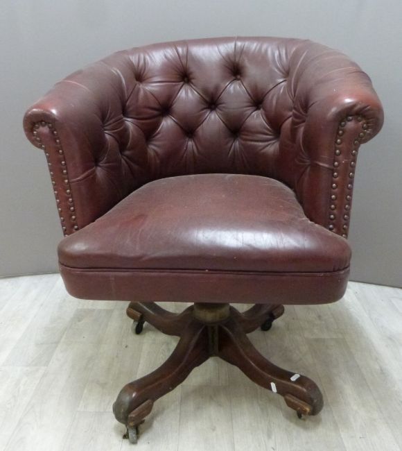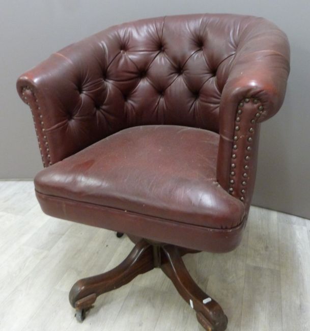 A vintage leather Chesterfield swivel / office chair with button back and wooden base, H87cm