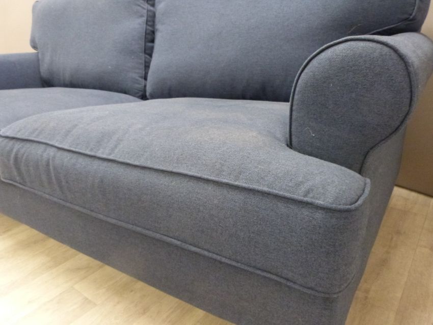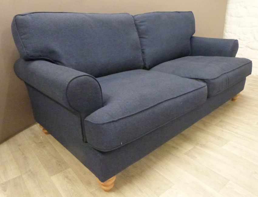A modern navy three seat sofa on turned wooden feet, W180 x D93cm x H90cm