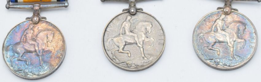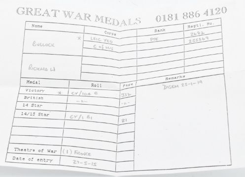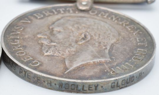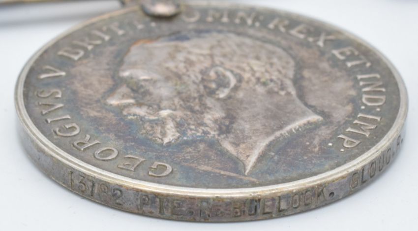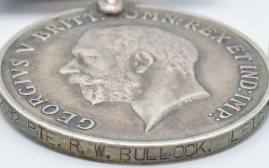 British Army WW1 medals comprising three War Medals named to 13782 Pte R Bullock, Gloucestershire Regiment, 2682 Pte R W Bullock, Leicestershire Yeomanry and 13838 Pte E H Woolley, Gloucestershire Regiment, killed in action 30/5/1918, enlisted in Stroud in the 8th Service Battalion