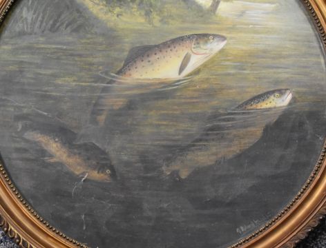 A. Roland Knight (British, 1879-1921) oil on board of three trout rising, diameter 28cm
