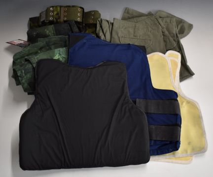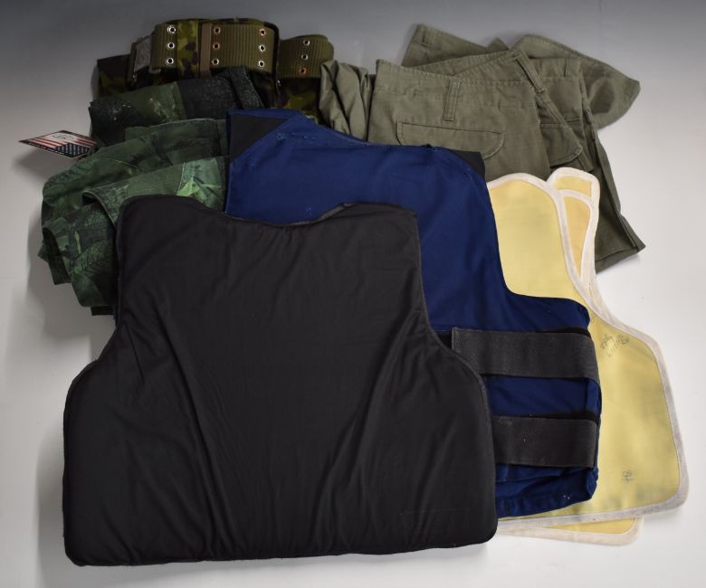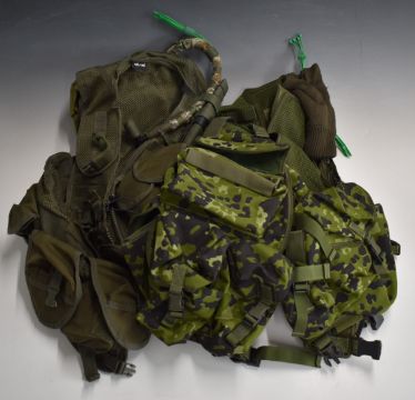 Modern military equipment including two webbing vests, entrenching tool, cleaning kits, ear defenders, bullet proof vest etc