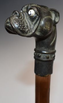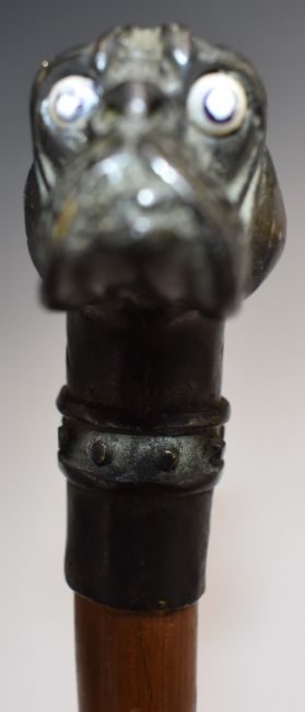 Victorian walking stick with bronze dog head finial with pearl eyes, 7cm