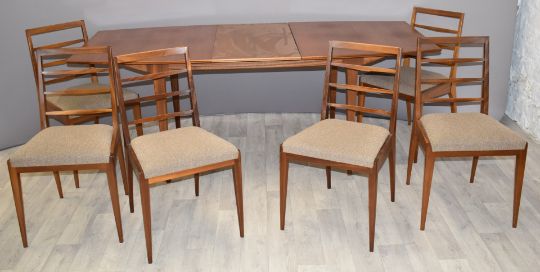 Retro mid century modern McIntosh table and six chairs, W154 x D92 x H74, extra leaf 46cm