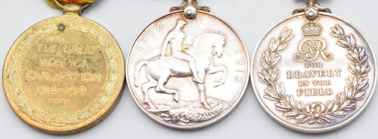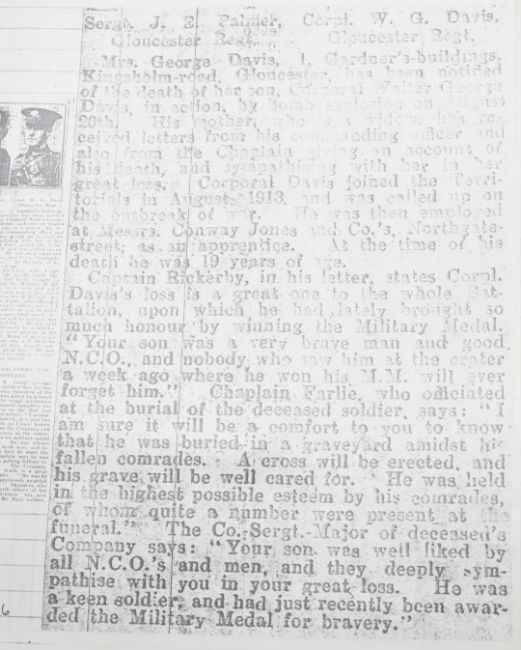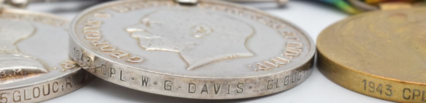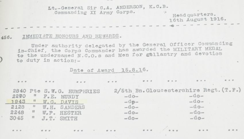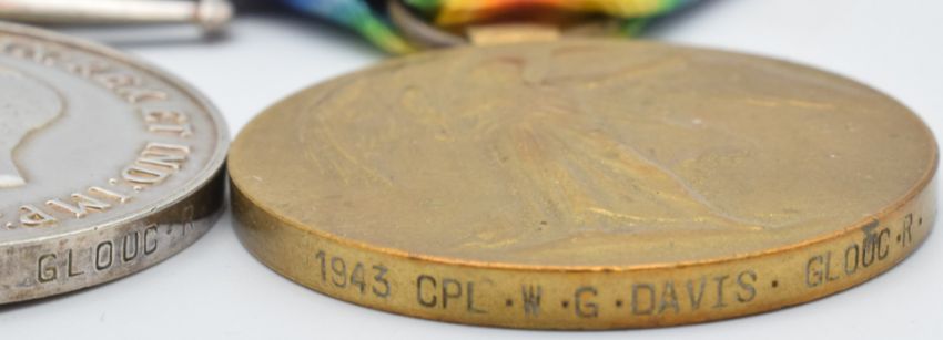 British Army WW1 Gloucestershire Regiment Military Medal immediate award to 1943 Cpl W G Davis, 2nd Battalion, together with his War Medal and Victory Medal, both named to Cpl Davis, with copy paperwork. The award was for action at Duck's Bill Crater on 15th August 1916, Cpl Davis was later killed in action on 26th August 1916.