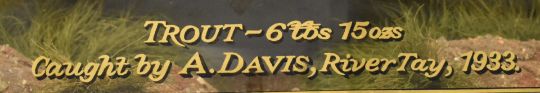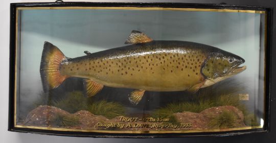Taxidermy study of a brown trout in glazed bow fronted case, with gilt script 'Trout 6lb 15ozs caught by A Davis, River Tay 1933', W76 x D20 x H36cm