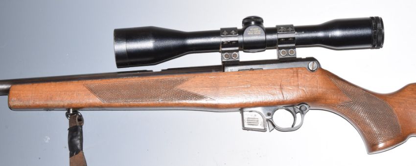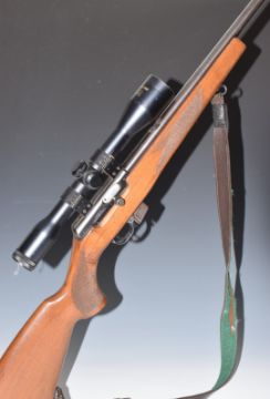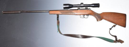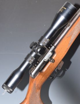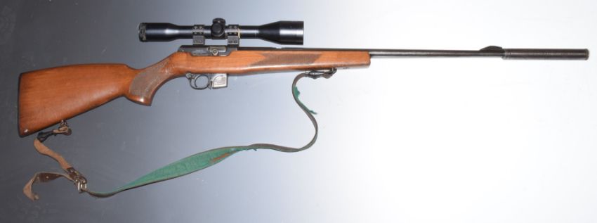 BRNO Model 2-E-H .22 semi-automatic rifle with chequered semi-pistol grip, magazine, leather sling, Sterling Bisley Deluxe scope, sound moderator and 28.5 inch barrel, overall length 113.5cm, serial number 54631. PLEASE NOTE THAT A VALID RELEVANT FIREARMS/SHOTGUN CERTIFICATE IS REQUIRED TO HANDLE/PURCHASE THIS ITEM.