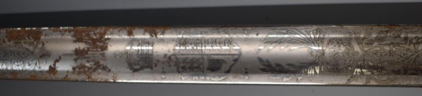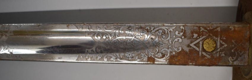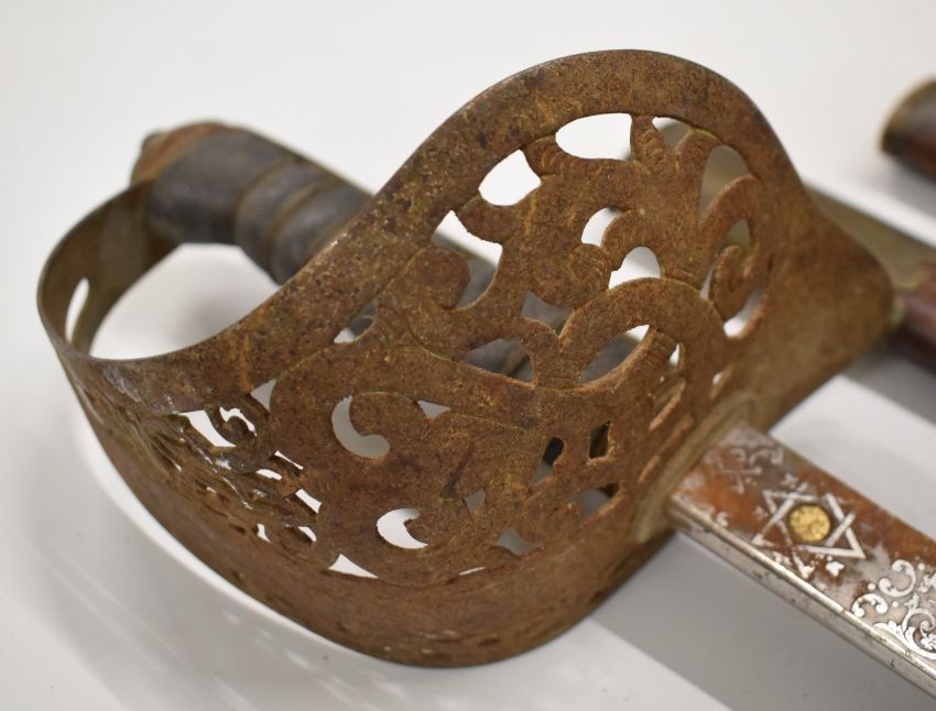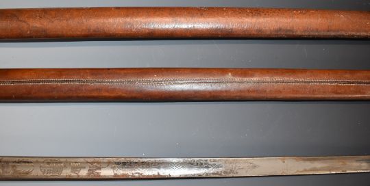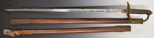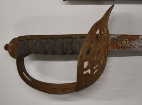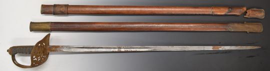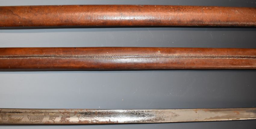 British 1895 pattern officer's sword with VR cypher to guard, Hanes & Co makers, 82cm blade with scabbard and spare.
