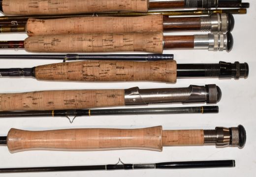 A large collection of coarse and trout fishing rods including Abu Legerlite, Bob Church River Kennet 9' AFTM 5-7, Kingsmill 9'6'' 6-7, Matchmaster Gordon Fly 7/8, Daiwa, Shakespeare and Shimano fly fishing rods, Shimano Fly 39067CL 9' AFTM 6-7 etc, together with three hard cases