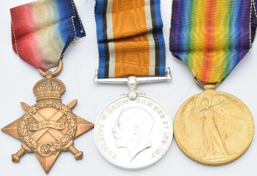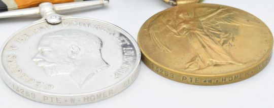 British Army WW1 medals comprising 1914/1915 Star, War Medal and Victory Medal named to 13269 Pte W Homer, Gloucestershire Regiment, with copy medal index card