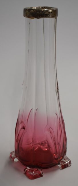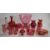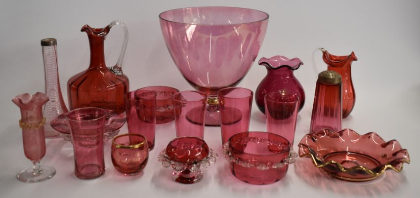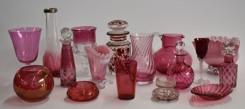 A collection of cranberry glass including enamelled, cut glass, and silver mounted examples, largest 21cm tall.