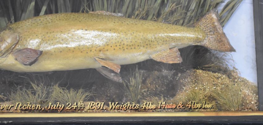 Victorian taxidermy study of two trout, in glazed case with gilt lettering 'Trout - Caught by W S Heath on the River Itchen, July 24th 1891, weight 4lb 14ozs and 4lb 1oz', J Cooper and Sons label top right, W94 x D18 x H50cm