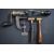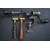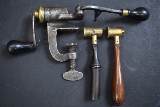 W Bartram Nimrod 12 bore shotgun cartridge rollover tool together with two brass powder measures, all with turned wooden handles.