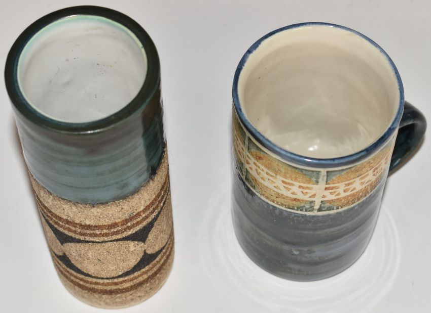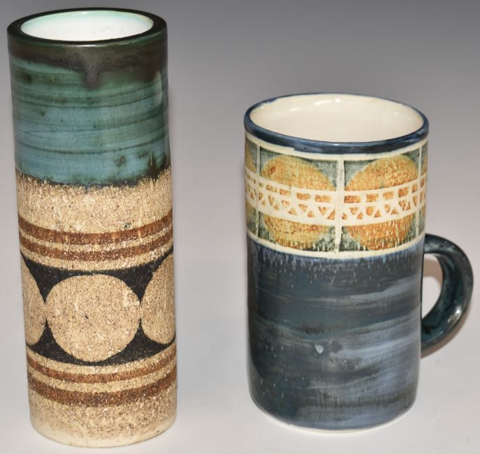Troika sleeve vase and a mug with printed and signed marks to bases, tallest 15cm