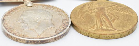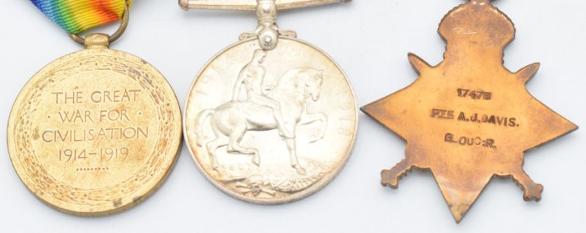 British Army WW1 medals comprising 1914/1915 Star, War Medal and Victory Medal named to 17478 Pte A J Davis, Gloucestershire Regiment, with copy medal index card. Pte Davis was born in Eastington, Gloucestershire and was killed in action during the Battle of the Somme on 31st July 1916