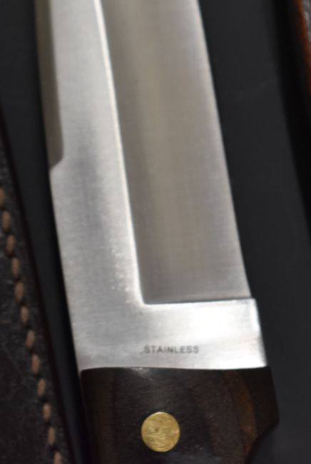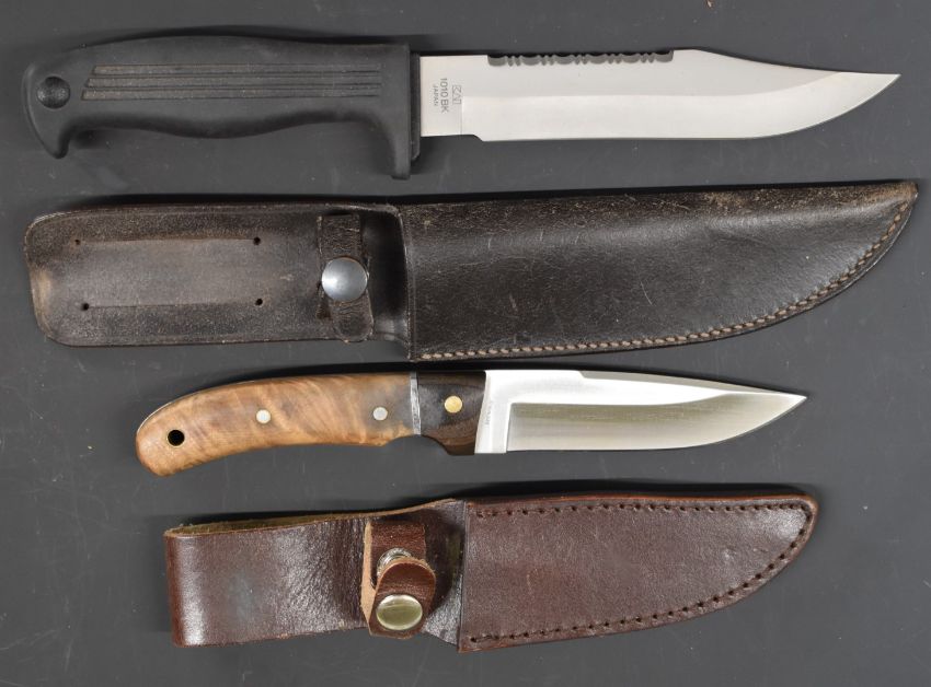 Two hunting or similar knives Kershaw 1010BK with 16cm blade and rubber handle and Whitby with 11cm blade and wooden handle, both in leather sheaths.