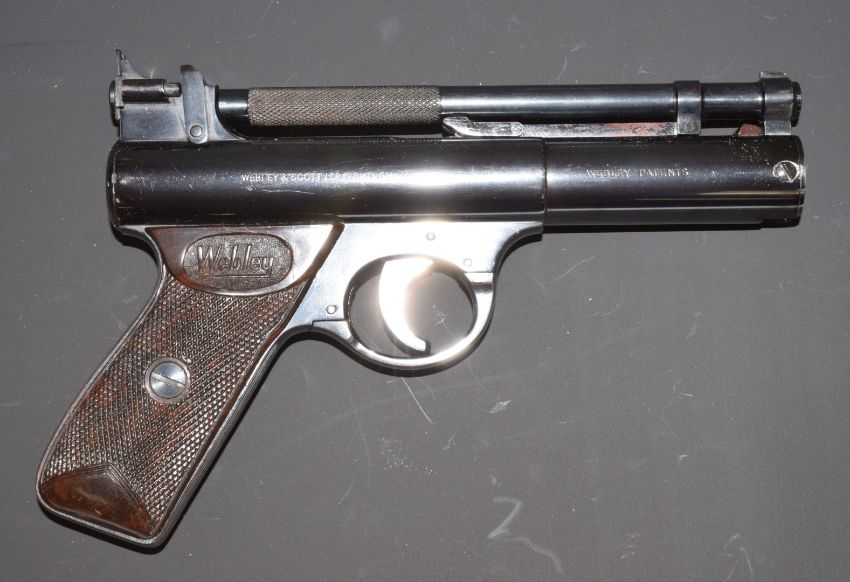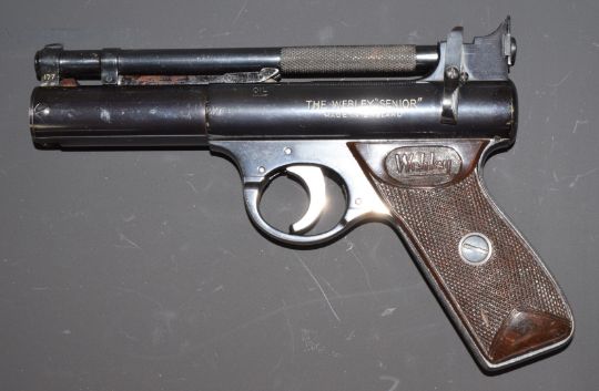 Webley & Scott The Webley Senior .177 air pistol with named and chequered Bakelite grips, serial number 540.
