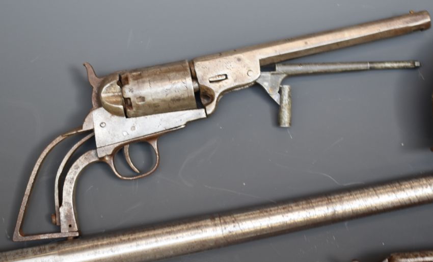 Three various revolvers comprising one Colt style, one Remington .44 revolver and one pinfire together with a percussion hammer action pocket pistol and a 29 inch gold inlaid part octagonal smooth bored Damascus barrel.