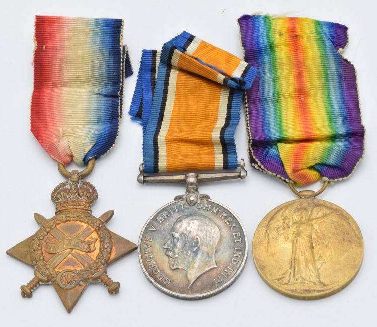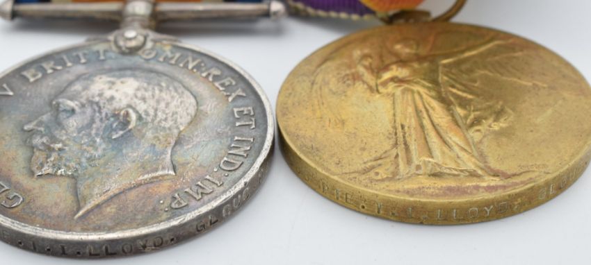 British Army WW1 medals comprising 1914/1915 Star, War Medal and Victory Medal named to Pte T I Lloyd (L/Cpl on Star), 12th Battalion Gloucestershire Regiment