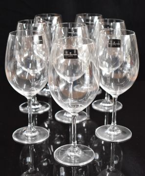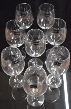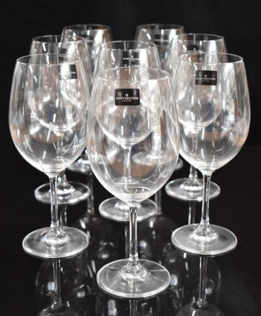 A set of eight Dartington F200/35 red wine glasses, new with stickers in original box, 23cm tall.