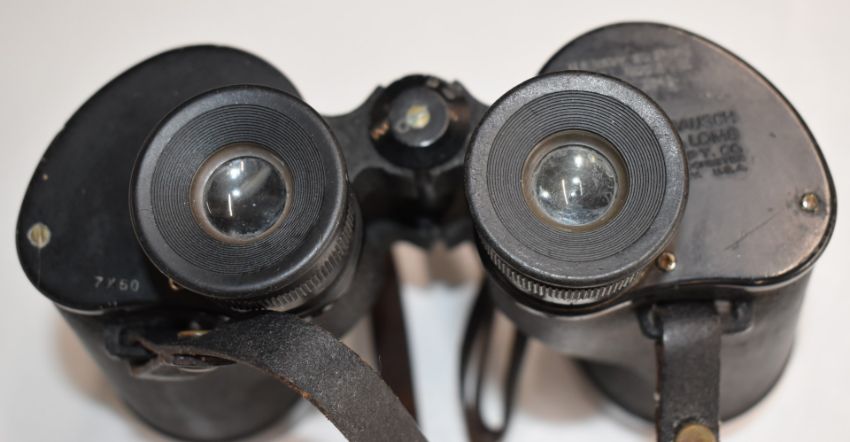 Pair of US Navy BU Ships Mark 1 7x50 binoculars, with broad arrow mark, dated 1941, made by Bausch & Lomb USA, with strap