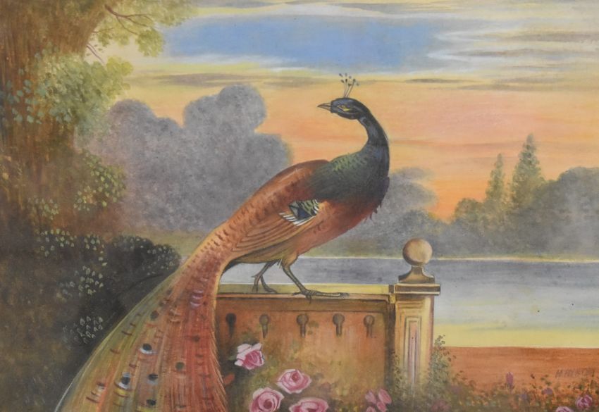 Harry Ayrton (Royal Worcester artist), watercolour of a peacock in a garden with lake beyond, signed lower right 18 x 26cm, in moulded frame