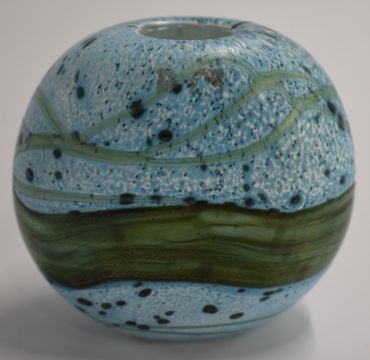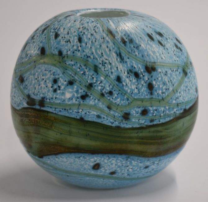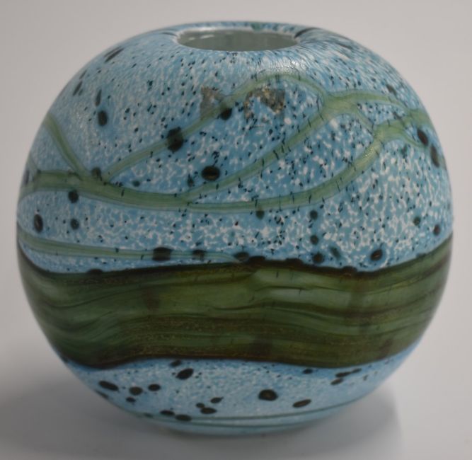 Gozo glass striated azure blue vase, signed to base, probably by Michael Harris, 9.5cm tall.
