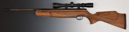 Webley Longbow .177 air rifle with chequered semi-pistol grip, raised cheek piece, adjustable trigger and 8-9x40 scope, serial number 010708557.
