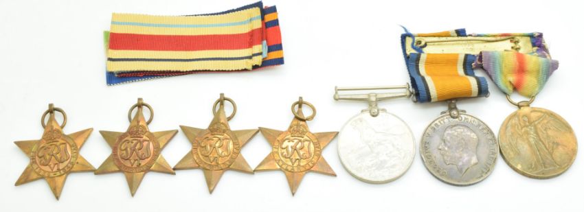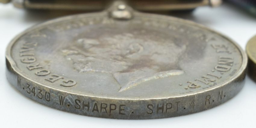 Royal Navy group of seven medals for W Sharpe RN, comprising WW1 War and Victory Medals, WW2 1939-1945 Star, Africa Star, Atlantic Star, Burma Star and War Medal