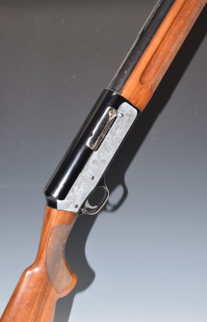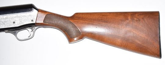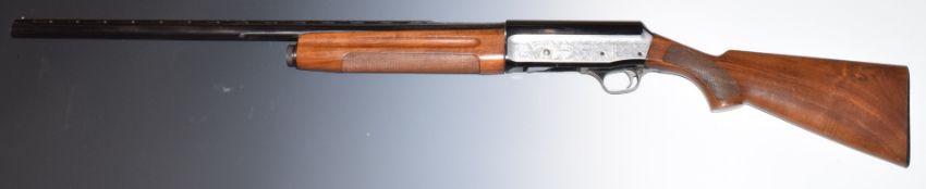 Luigi Franchi 48AL Hunter 12 bore three-shot semi-automatic shotgun with engraved scenes of birds, tigers and hunters in a boat to the lock, chequered semi-pistol grip and forend, raised ball sight, vented rib, single trigger and 28 inch barrel choked ¾, overall length 122cm, length of pull 36cm, serial number D81540. PLEASE NOTE THAT A VALID RELEVANT FIREARMS/SHOTGUN CERTIFICATE IS REQUIRED TO HANDLE/PURCHASE THIS ITEM.