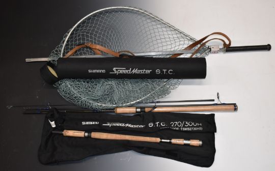 Shimano Speedmaster STC travel spinning rod in case, Shimano Nexave - DX 270H-3 three piece spinning rod and a large folding salmon/trout landing net