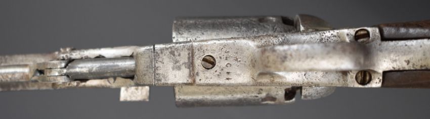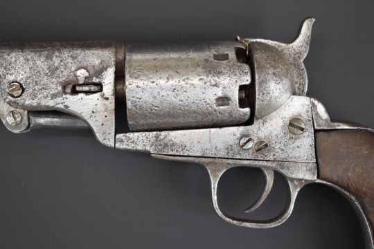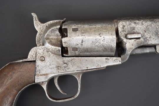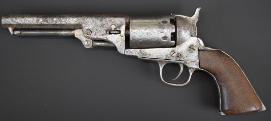 Colt style .36 six-shot single action revolver with indistinctly named cylinder, shaped wooden grips and 5.5 inch octagonal barrel, overall length 32cm.