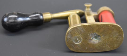 Brass 16 bore shotgun cartridge capper and decapper tool with turned wooden handle and Eley shotgun cartridge case.