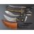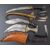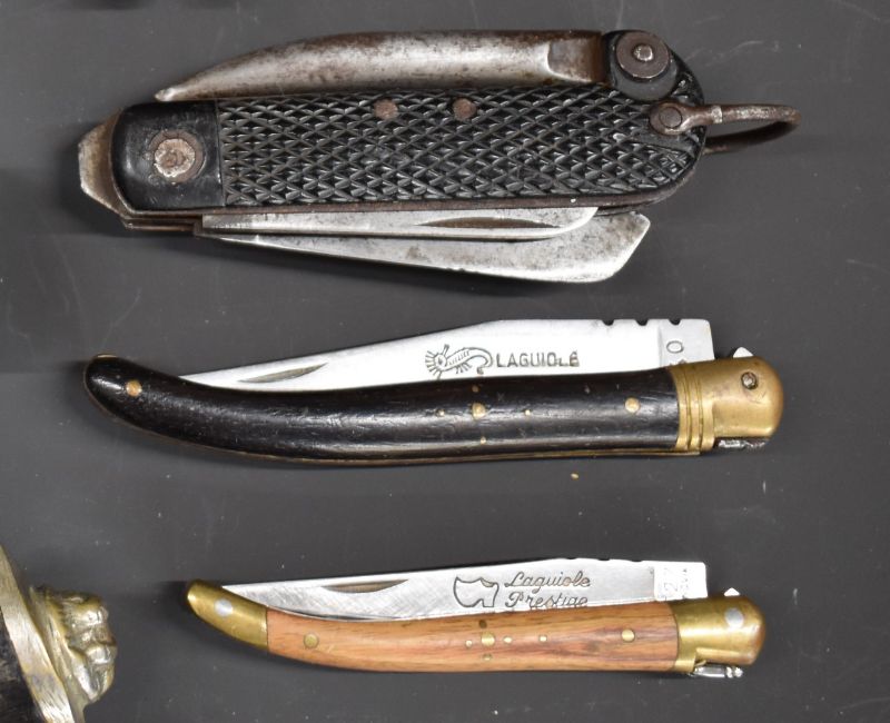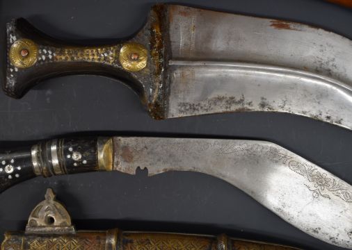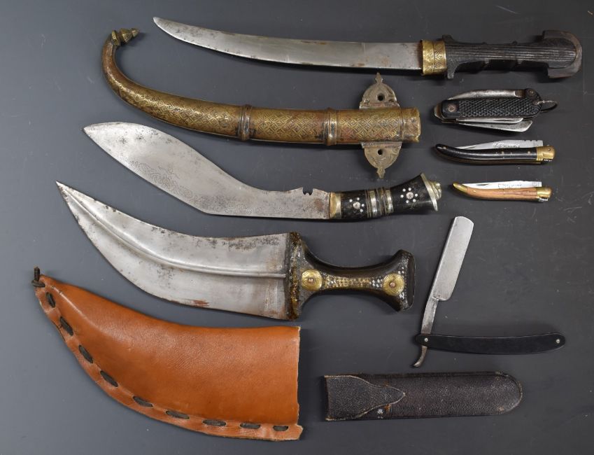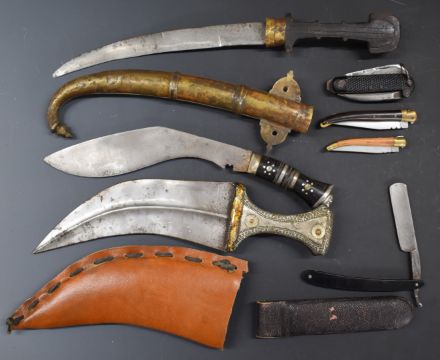 Six various knives / daggers including two oriental examples, kukri and a clasp knife, longest blade 24cm together with a cut throat razor