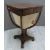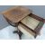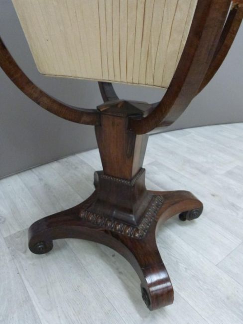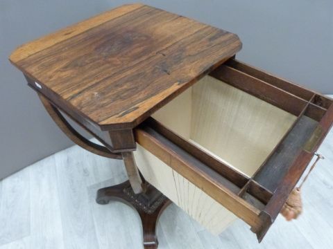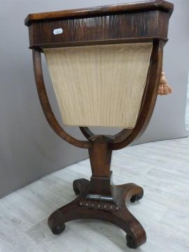 Victorian rosewood work table with four shaped supports raised on a square tapering gnarled quatrefoil base on castors, W40 x D41 x H73cm