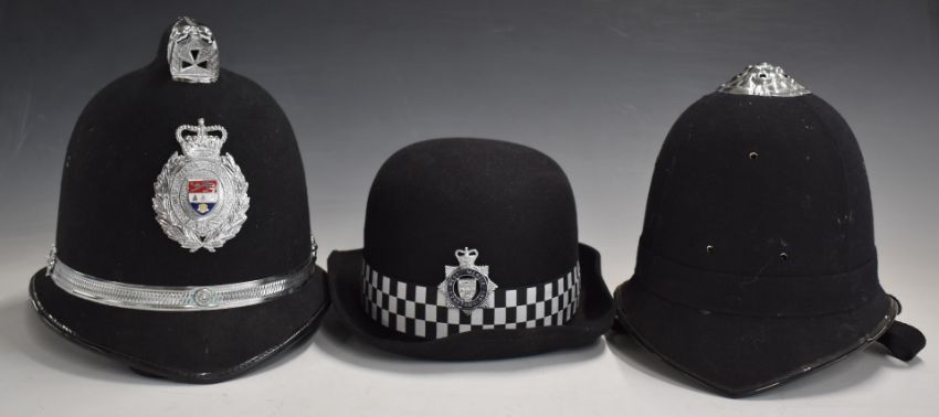 West Mercia Constabulary policeman's helmet, together with an unbadged example, both with liners and chinstraps, and a West Mercia Constabulary policeman's helmet size 7 1/4