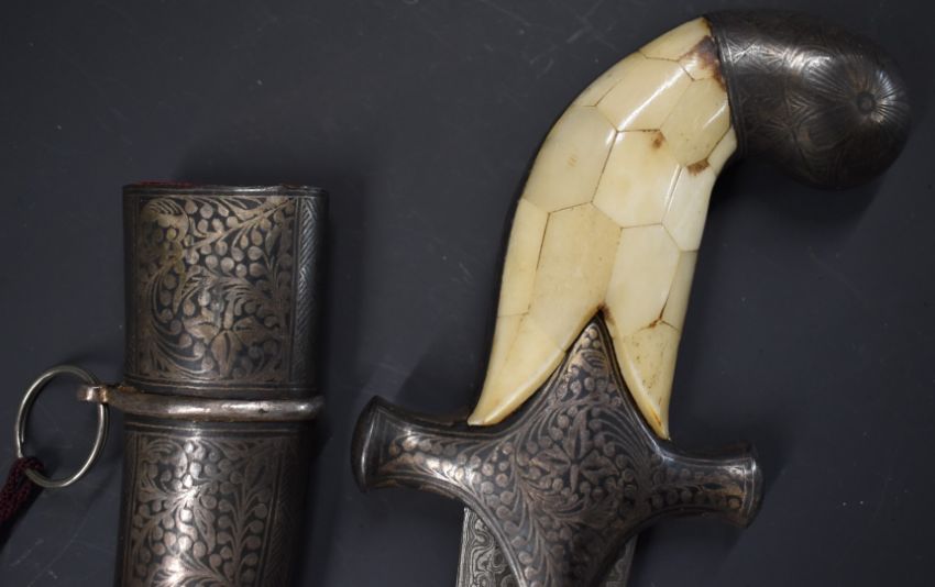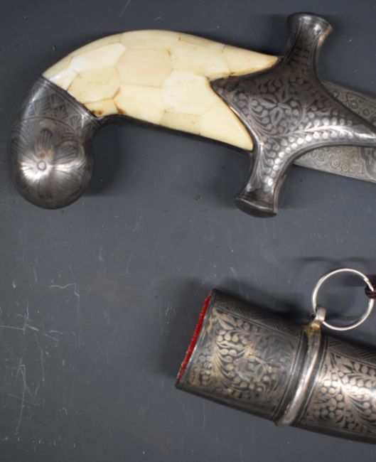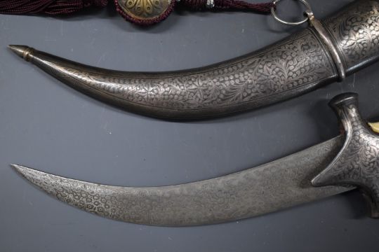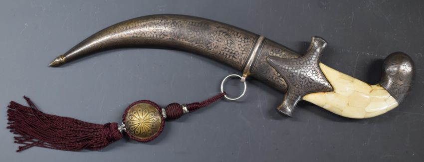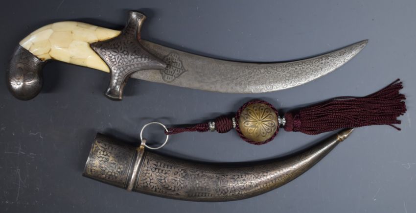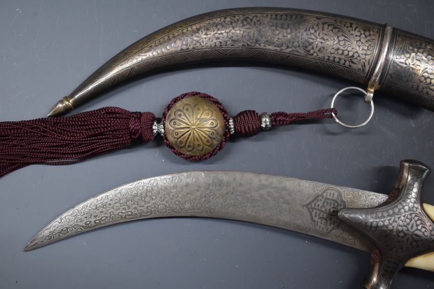 North African Jambiya dagger with Arabic script to the eight inch curved Damascus blade, bone grip and niello decoration to the hilt, pommel and scabbard, overall length 34.cm.